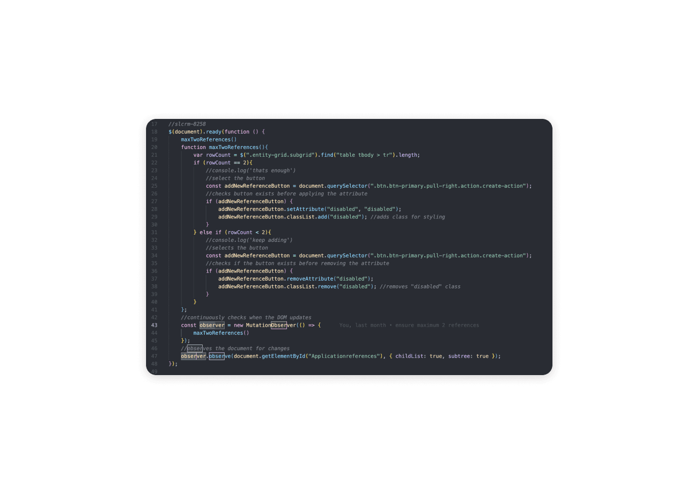 For one of the tickets I worked, I resolved an issue where applicants could previously add more than two references despite the system limit, leading to confusion when they were unable to proceed after creating a third reference. To address this, I implemented an observer mutation to monitor the reference section and dynamically disable the "Add Reference" button when two references were present. This same logic re-enabled the button when only one reference was present, ensuring the functionality was seamless without requiring a page refresh. I then isolated the specific div to be monitored in order to optimise performance and avoid calling the function excessively.