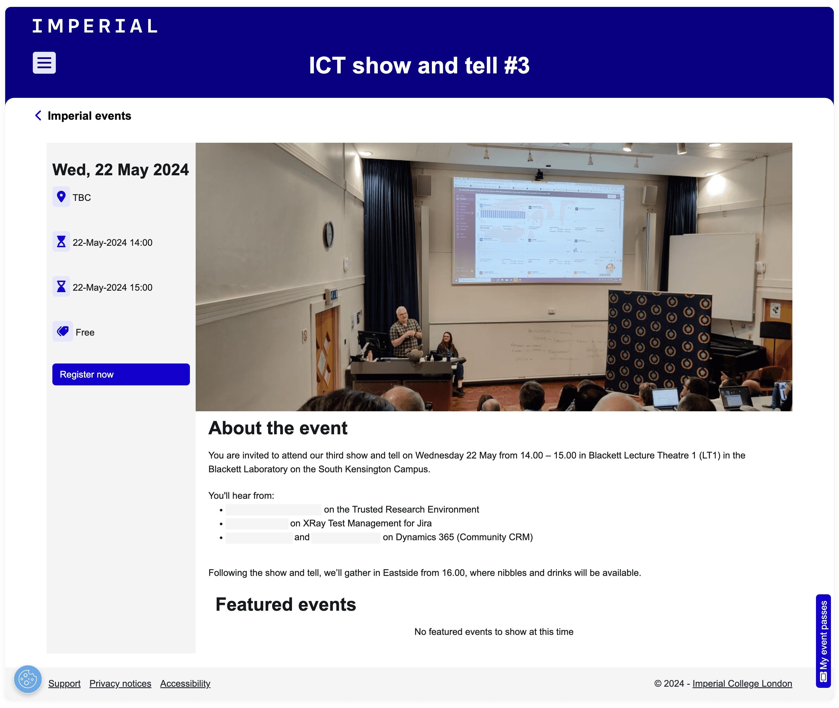 The ability for users to view previous events they've attended is one of its most useful features. This functionality not only provides a record of event participation but also allows admins to invite previous attendees to new ones with ease. Microsoft Dynamics is used to store all event data in a single, central CRM system, ensuring the data remains easily accessible and organized. Furthermore, GDPR compliance remained a priority in the development, ensuring no personal details were exposed, while allowing public access to events. Staff and students also benefit from autofilled details during login, making registration fast and seamless. Event confirmations and registrant information are also visible in the backend/admin view and additional events are visible to staff and students who are logged in.
