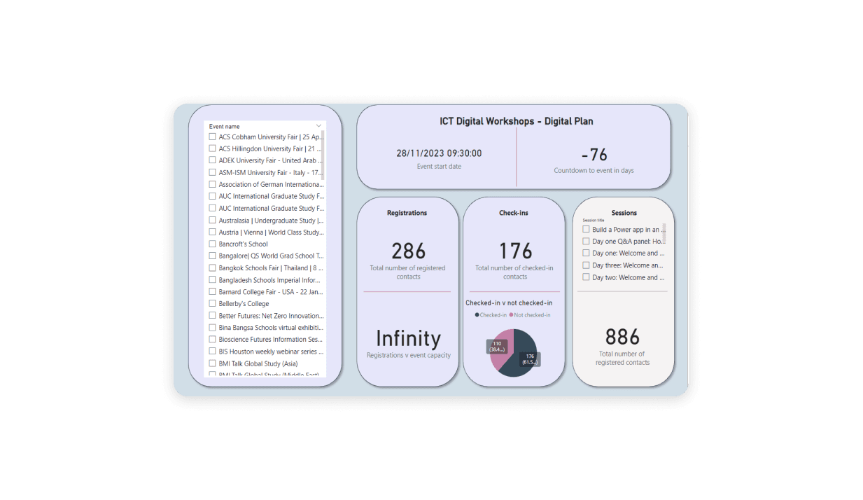 Accompanying admin app - the events app has an admin app that accompanies it. This would allow staff to see information about upcoming and current events throughout their cycle. The app would also display analytics on dashboards to give an overviews of relevent information (e.g. nunmber of registrations against actual check-ins).