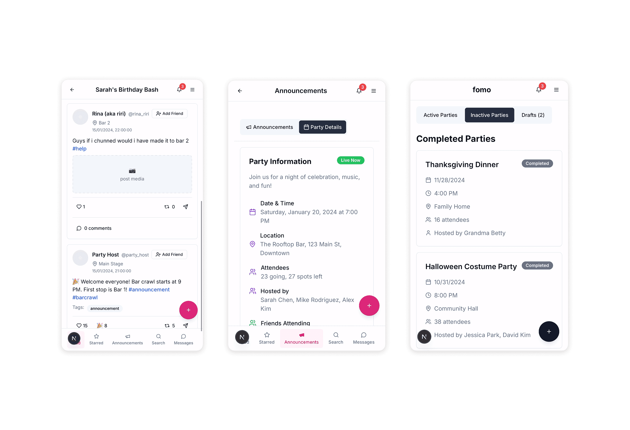 Developed using Next.js 15 (App Router) and a nested context provider architecture for authentication, party management, and friend relationships. The UI was built with Tailwind CSS and Radix UI for a consistent, responsive, and accessible design. Real-time features were powered by Supabase subscriptions, enabling live updates across clients.