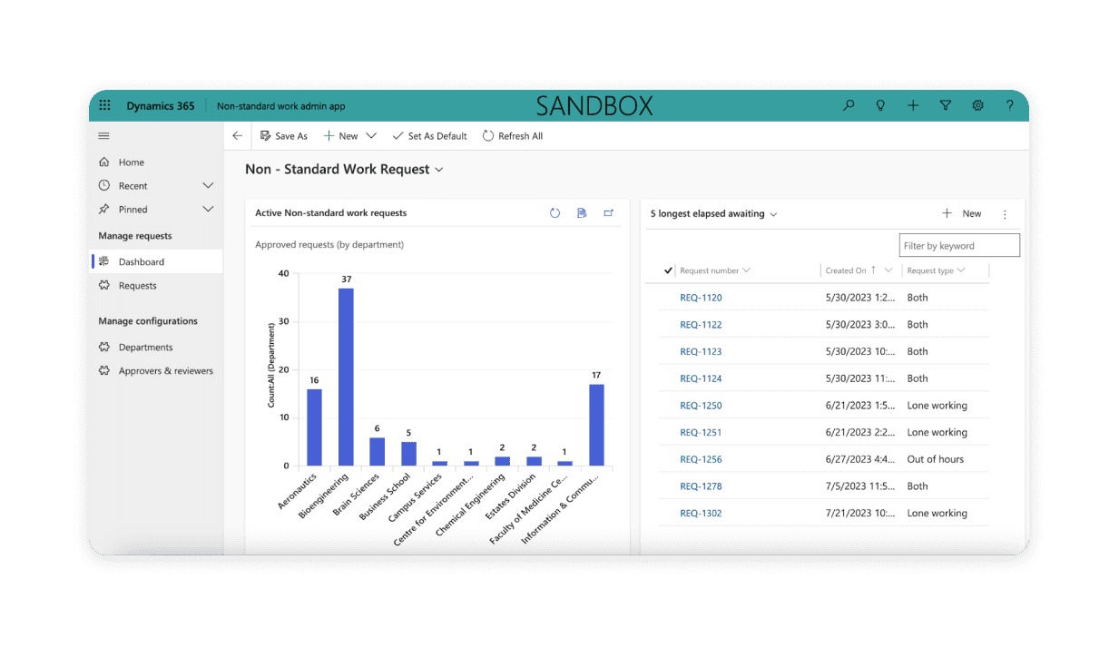 The Non-standard work requests (also known as Out-of-hours/lone-working, or OOHLW) is a solution that allows post graduate students and staff to request permission to work on their own or out of standard working hours in hazardous environments (e.g. labs must allow these requests too go through approval gateways before any work commences). The purpose of the project was to streamline the process of seeking and giving permission for the activities to replace an already existing solution on legacy software.