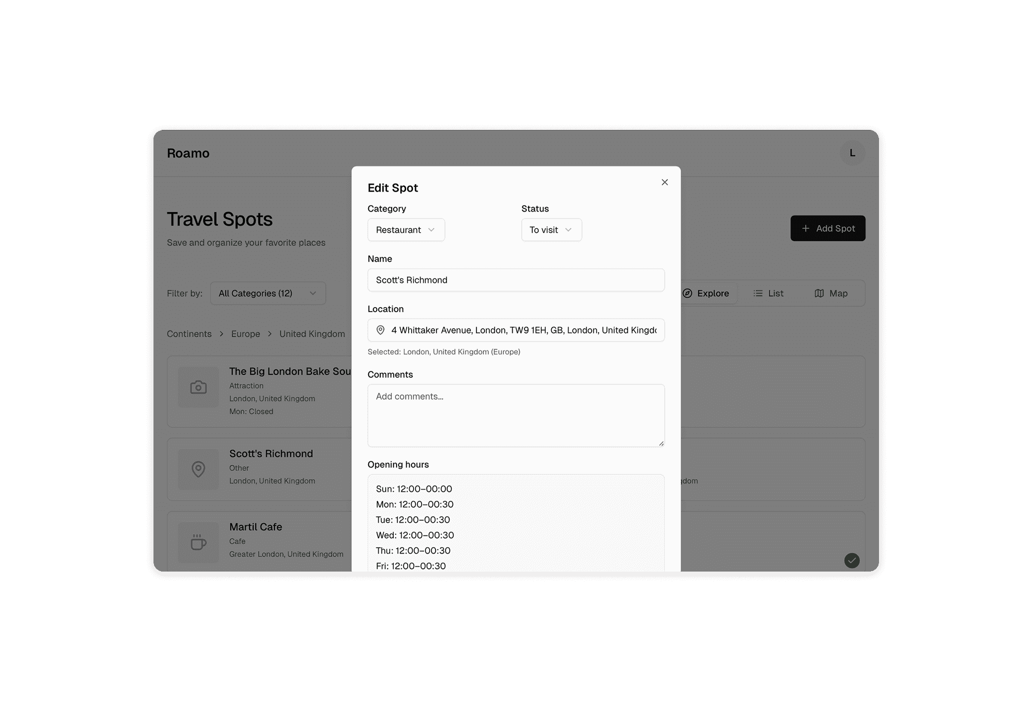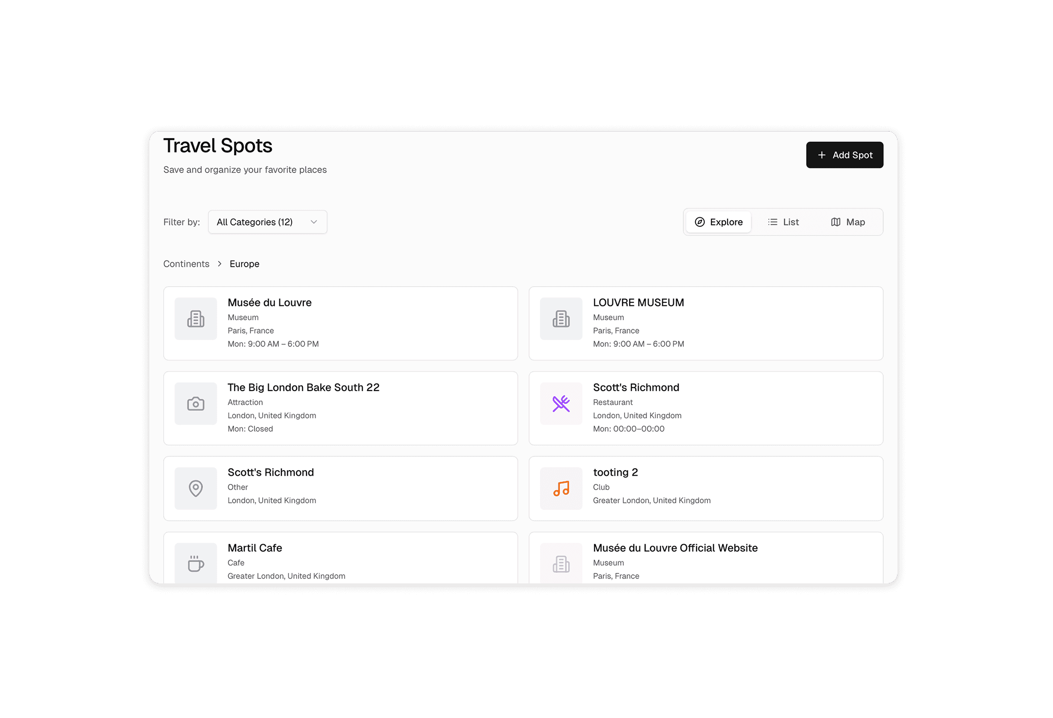Quick Add: Auto-draft spots from links, with AI-assisted category and metadata enrichment.