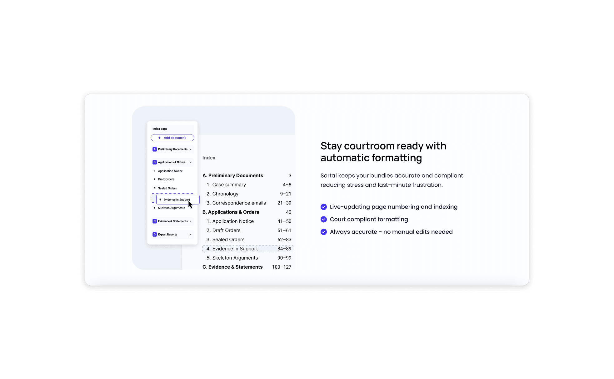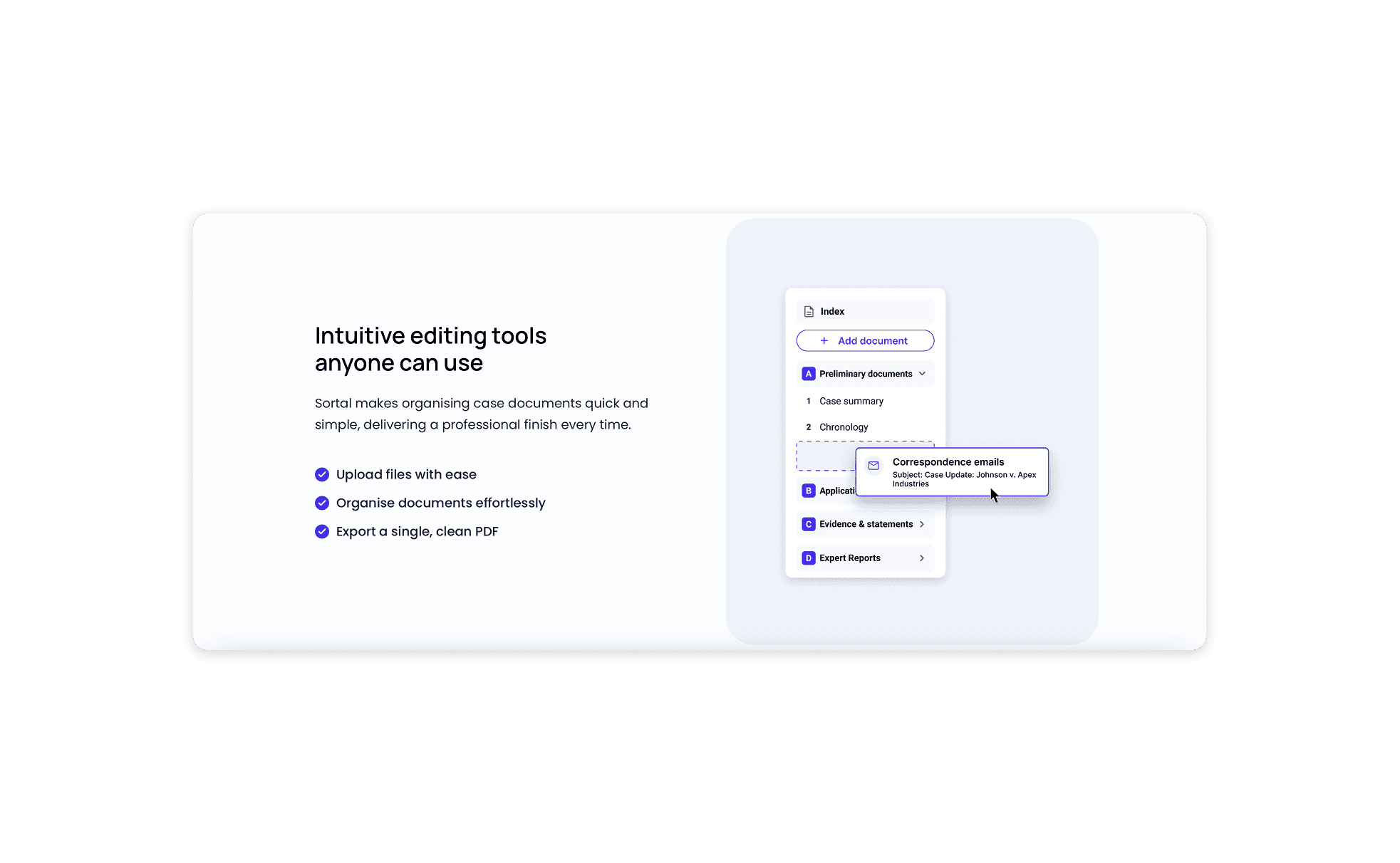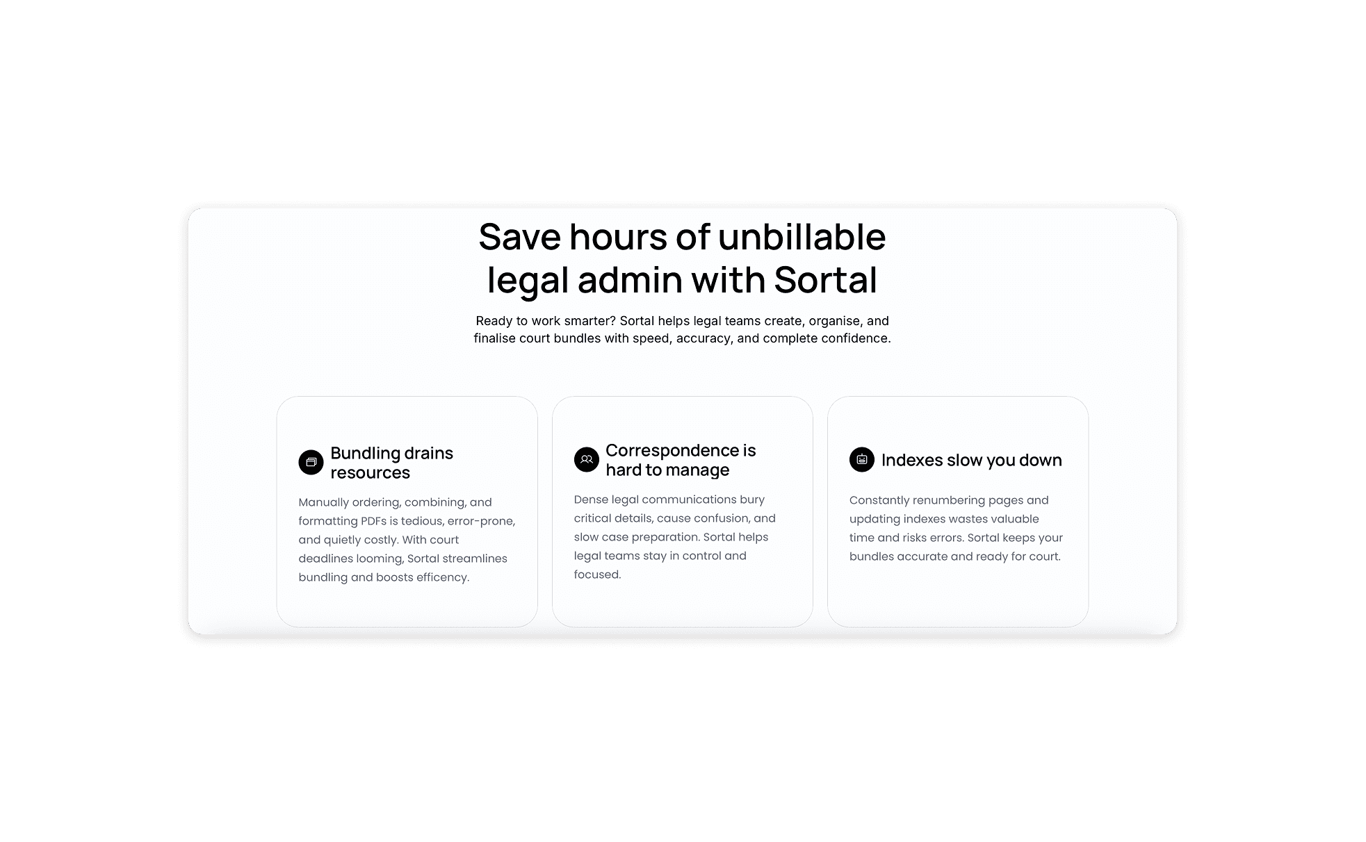 Developing the front-end MVP for Sortal - a law bundling software - involved building a responsive dashboard and bundle management system enabling users to create, search, and organise legal case bundles efficiently. Key features included dynamic page numbering, a bookmarks bar with drag-and-drop reordering, an automatically updating index, and PDF export that preserved formatting, hyperlinks, and page ranges. The email parser converted threads into structured, numbered A4 pages, maintaining forks in conversation chains. This MVP allowed Sortal to demonstrate functionality to potential clients, accelerate customer acquisition and validate core workflows. This was delivered in just five weeks.
